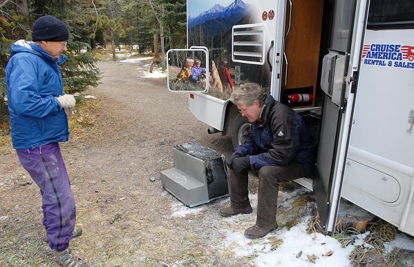 Ein netter Mensch mit zwei Hunden, das konnte nur ein Kandier sein, wurde dann mit den Worten angesprochen "Sie sehen aus wie einer dieser gut ausgerüsteten Kanadier...". Und tatsächlich, an dieser Stelle ein großes Dankeschön an den netten Herrn unten auf dem Bild. Er hatte nämlich nicht nur einen Schraubenzieher, sondern auch eine Brechstange bzw. Kuhfuß dabei, zudem half er Michael auch tatkräftig beim herausoperieren der Treppe. Zwischenzeitlich waren zufällig auch zwei junge Damen von der Parkverwaltung eingetroffen, die uns rieten, die 30 Kilometer zurück nach Lake Louise zu fahren - Handy und Funk würden hier nicht funktionieren. Fahrtüchtig war der Camper ja noch.