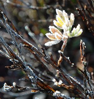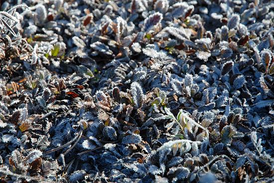 Nach einer guten Nacht unter warmen Decken standen wir am nächsten Morgen ganz früh auf. Ein Blick aus den Fenster - es regnete nicht, nur ein paar Eisblumen behinderten die Sicht aus dem Alkoven. Wir beschlossen, uns schnell in die warme Kleidung zu werfen und ohne Frühstück loszufahren, um so die Lichtstimmung er ersten Sonnenstrahlen auf den weißen Bergen zu erleben. Von unserem Standplatz aus sah man fast nur hohe Nadelbäume und kaum Berge.
