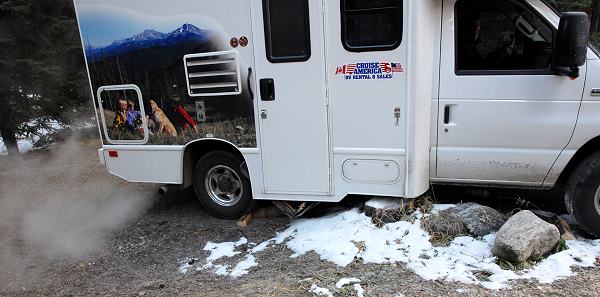 Die Temperaturen im September im Jahr 2010 lagen eigentlich immer ein wenig unter den Mittelwerten, was uns in den Rockies einige kalte Nächte bescherte. Vor allem bei den Übernachtungen am Icefields Parkway hatten wir durchaus schon Minustemperaturen. Am Morgen waren es dann im Camper, trotz Heizung, um die 6°C. Zum Frühstück hatten wir den Innenraum dann auf muckelige 14°C aufgeheizt. Dagegen hilft nur warme Kleidung und ein heißer Kaffee am Morgen.