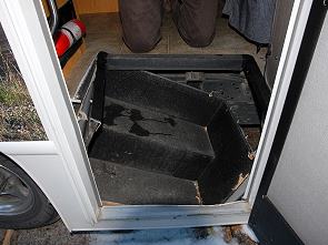 Es kirschte und knackte ganz gewaltig und dann ging es weder vor noch zurück. Die Holztreppe mit Metallkasten rund herum war an der Vorderseite aus dem Fußboden herausgerissen und hatte sich komplett nach hinten in Richtung Reifen verschoben, die dünne Schrankwand zum Kühlschrank war vom verbogenen Fußboden nach oben geschoben und gebrochen - dort gab es aber eine Sollbruchstelle zwischen Bodenlampe und Feuerlöscher.