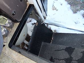 Beim Herausfahren aus dem Stellplatz passierte es dann: Wir konzentrierten uns darauf, den nahen Baum auf der linken Seite nicht zu streifen, da hoppelte der Camper mit dem rechten Vorderreifen über eine dicke Unebenheit, vermutlich ein Findling im Boden. Eigentlich nicht weiter schlimm, über eine Bordsteinkannte kann man ja auch fahren. Hier war es aber ein unter der Schneeschicht gut getarnter Baumstumpf, dahinter ein Stein. So senkte sich der Wagen nach einem Meter wieder ab und an dem Baumstumpf blieben wir nun mit der tief liegenden Eingangstreppe hängen.