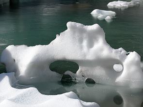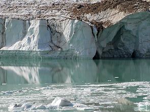 Das Wasser war teilweise noch von einer hauchdünnen Eisschicht bedeckt und die ganze Szenerie erinnerte uns sehr an den Urlaub im südlichen Argentinien, an die Gletscherseen in Patagonien. Wenn auch nur im Mini Format war dies hier ein beeindruckender Anblick. Ständig läuft Wasser von oben nach, der Gletscher schmilzt. Fotos von 1915 sind auf Schautafeln zu sehen, aber dieser Gletscher hat sich seit damals nicht dramatisch verändert.
