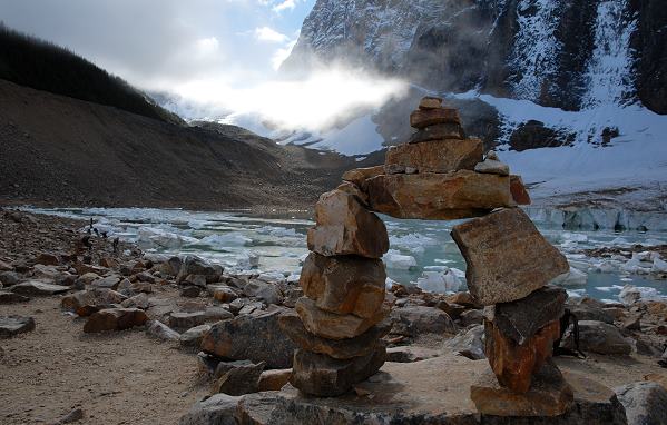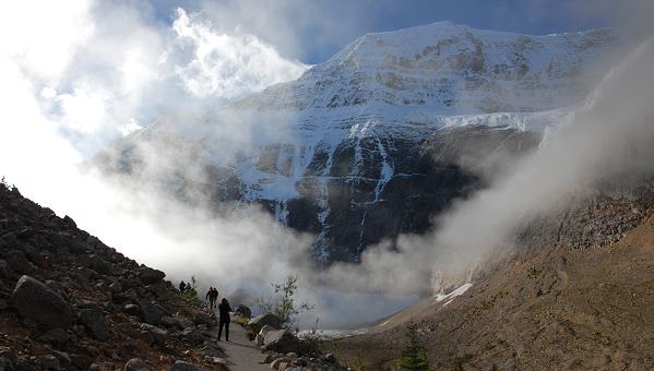 Nachtrag 2018: Den Weg, den wir hier 2010 beschrieben haben gibt es leider nicht mehr. Nachdem 2012 ein Stück vom Gletscher abgebrochen ist und im See eine Springflut auslöste, hat die Flutwelle die Ufer verwüstet. Wanderer dürfen seitdem nicht mehr bis ans Seeufer ran, nur noch zu einer Aussichtsplattform. Ausserdem braucht man mittlerweile ein Permit um die Zufahrtsstraße benutzten zu dürfen. Das Permit erhält man am Visitor Center in Jasper morgens zwischen 8:00 und 10:00 Uhr für den folgenden Tag.