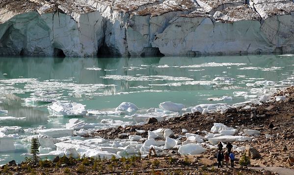 Schnell holen wir unsere Fotoausrüstung aus dem Auto und machen uns auf den Weg. Schon an der ersten Bank angekommen verspüren wir Begeisterung auf Grund der herrlichen Sicht. Ein paar Wolkenfetzen hängen noch an den Bergen, die sich aber auch langsam heben. Der Wanderweg, der 1,5 Kilometer lange "Path of the Glacier Trail", führt direkt zu einem türkisen Schmelzwassersee, in dem oft Eisblöcke treiben.