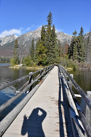 Nach ein paar Minuten Fahrt ist dann nach 7,5 Kilometern ab Jasper der Endpunkt der Straße erreicht: der Parkplatz vor Pyramid Island. Laut Karte geht die Straße dahinter noch weiter, aber die Zufahrt war gesperrt. Es gibt ein gut gepflegtes Toilettenhäuschen hier und ein kurzer Spaziergang führt auf die beliebte Insel.