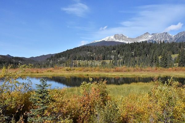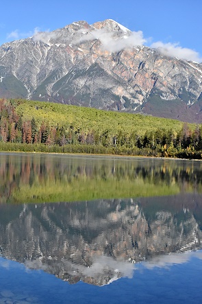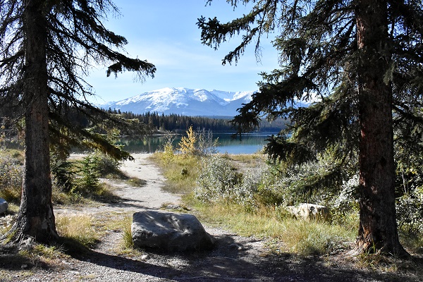Kurz danach erreicht die Straße das Südostufer des nierenförmigen, 1.2 km² grossen Pyramid Lake. Sein Abfluss ist der Pyramid Creek, der in den Athabasca River mündet.