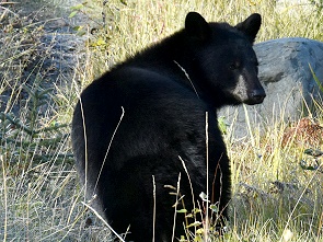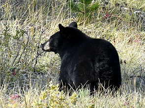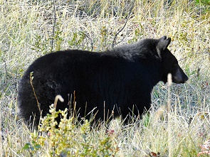 Schon nach der zweiten Kurve hatten wir Glück: Menschen standen am Strassenrand. Das bedeutet immer Wildlife und auch wir parkten und schauten nach. Auf einer Wiese war ein Schwarzbär unterwegs, der nach Futter suchte. Er bewegte sich von der Strasse weg und war ziemlich gut getarnt. Im Grunde sah man nur einen schwarzen Fellknubbel und ganz selten hob er mal die Schnauze vom Boden. Dick und warm angezogen haben wir es ganz begeistert bei der Sichtung eine Weile ausgehalten und ihn beobachtet, es war bitterkalt.