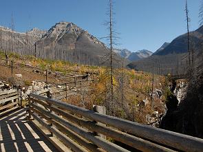 Die schönsten kleinen Spaziergänge befinden sich weit hinter Vermilion Crossing. Von zwei Parkplätzen am Parkway führen kurze Wege zu den Paint Pots und zum Marble Canyon. Leider hat es dort in Strömen geregnet. Diese beiden Attraktionen besuchten wir später noch einmal aus Richtung Banff bei schönstem Sonnenschein, daher sind die meisten Bilder auf dieser Seite auch bei gutem Wetter entstanden.
