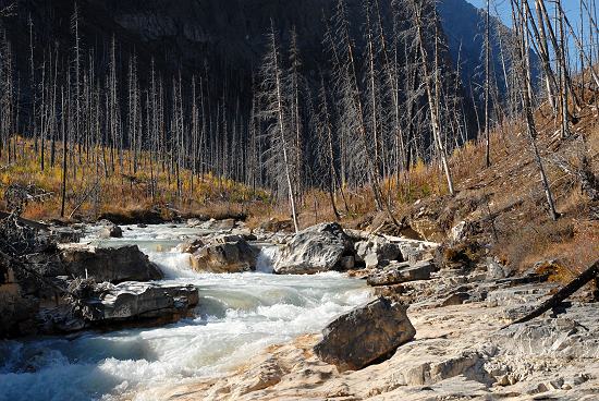 Alleine um den Marble Canyon zu besuchen, hat sich die erneute Fahrt in den östlichen Teil des Nationalparks bei schönstem Wetter gelohnt. Dabei passiert man vom Bow Valley Parkway, von Banff oder Lake Louise kommend zuerst die Continental Divide, die Wasserscheide zwischen Banff und Kootenay. Auf der Ostseite fließt das Wasser in den Atlantik zur Hudson Bay via Bow, Saskatchewan und Nelson River. Auf der Westseite fließt das Wasser zum Pazifi über den Vermillion, Kootenay und Columbia River.