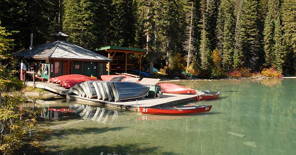 Nachdem uns die Ruhe am Emerald Lake so begeistert hatte und wir die warmen Sonnenstrahlen am Ufer genossen hatten, entschlossen wir uns spontan zu einer kleinen Kanutour. Während man an einigen anderen Seen für mindestens 2 Stunden oder gar einen ganzen Tag leihen musste, gab es hier am Bootshaus auch Kanus für eine Stunde. Vollkommen ausreichend, um den recht kleinen See zu umrunden und für ungeübte Kanuten auch genug Zeit. Die netten Ladys am Bootshaus kassieren 32 Dollar, dann bekommt man die Schwimmwesten und ein Kanu in knalligem Rot-Orange zugewiesen.