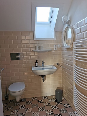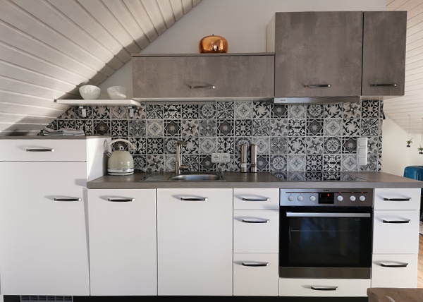 Die Dachschrägen an den Seiten störten auch den langen Michael nicht, denn in der Mitte war die Raumhöhe großzügig und die Möbel so durchdacht aufgestellt, dann man sich nirgendwo den Kopf anstösst. Die ganze Wohnung ist 63 m² groß und für zwei Personen ausgestattet.