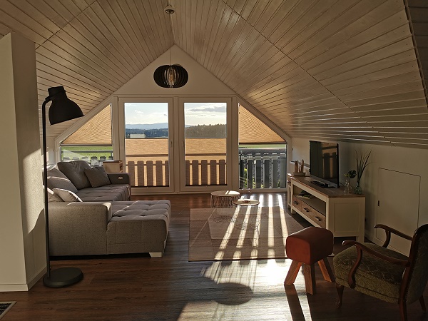 Schon der erste Eindruck entspach den Erwartungen. Hier befindet man sich in einem hellen, modern ausgestatteten loftähnlichen Raum und aus den großen Fenstern blickt man direkt über Felder und Wald ins Fichtelgebirge.