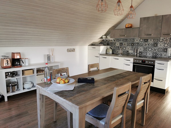 Die Ferienwohnung liegt alleine in der oberen Etage eines Einfamilienhauses am sehr ruhigen Stadtrand. Die Wohnung darunter ist vermietet, von den Bewohner bekamen wir aber so gut wie nichts mit. Eine Treppe führt hinauf in die mit 4 Sternen ausgezeichnete und 2018 eröffnete Ferienwohnung.