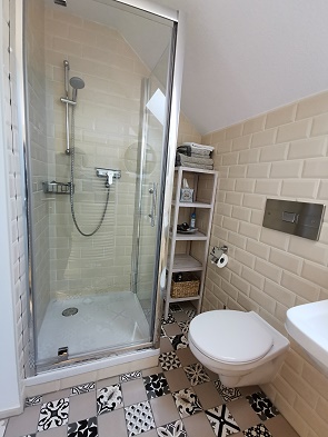 Das Badezimmer ist ebenfalls sehr schön gestaltet, hier gibt es eine gute Dusche mit kräftigem Strahl. Föhn und Handtücher liegen bereit.