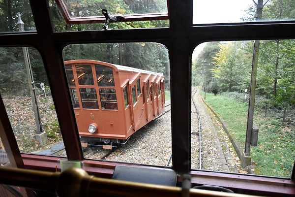 Hier mussten wir dann in die alte Bahn umsteigen, in einem kleinen Café innerhalb der Bergbahnstation kann man sich stärken. Oder man geht zur Sonnenterasse vom Schlosshotel Molkenkur. Hier speist man mit beeindruckenden Panorama genau dort, wo sich in früheren Zeiten Kurgäste dem Fasten mit Ziegenmolke widmeten.