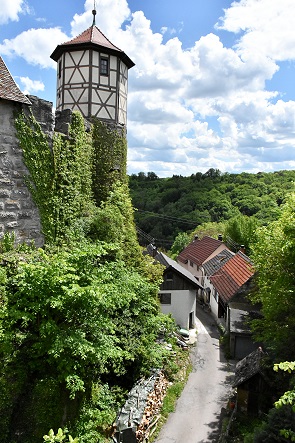 Unterschätzt hatten wir hier die sehr engen und extrem steilen Straßen, die hoch zur Burg durch den Ort führen. Bei Gegenverkehr hatten wir keine Muße, uns den schönen Ort genauer anzusehen und oben angekommen, waren wir für einen steilen Spaziergang bergab in das hübsche Burgdorf zu müde und es war uns in der Sonne viel zu warm. Die Herausforderung an den Fahrzeugführer wird vielleicht klarer, wenn sogar die Müllabfuhr von oben her nur rückwärts in den Ort fährt, um auch wieder heraus zu kommen.