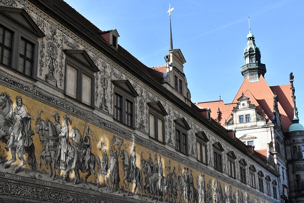 Der Fürstenzug befindet sich in der Augustusstraße, unweit der Frauenkirche, zwischen Georgentor auf der einen Seite und dem Johanneum auf der anderen Seite. Es ist ein überlebensgroßes Bild eines Reiterzuges, aufgetragen auf rund 23.000 Fliesen aus Meißner Porzellan. Das 102 Meter lange, als größtes Porzellanwandbild der Welt geltende Kunstwerk stellt die Ahnengalerie der zwischen 1127 und 1873 in Sachsen herrschenden 34 Markgrafen, Herzöge, Kurfürsten und Könige aus dem Geschlecht des Fürstenhauses Wettin dar. Rechnet man jedoch noch den am Schluss des Zuges reitenden Prinzen Georg hinzu, der später auch König war, dann ergibt sich eine Gesamtzahl von 35 Herrschern der Wettiner, die hier im Reiterzug zu sehen sind.