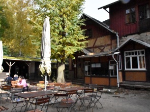 Das historische Berggasthaus hier auf dem Gipfel befindet sich seit weit über 100 Jahren in einem fast unverändertem Zustand. Die Berggasttätte Pfaffenstein war aber leider geschlossen, wahrscheinlich weil wir in der Woche vor Ort waren. Immerhin ein Automat bot hier Getränke und Süssigkeiten. Auch der Aussichtsturm war an diesem Tag zu, nur mehrere Aussichtspunkte, Schluchten und Felsen konnte man erreichen. Schade, aber besser als mit noch mehr Menschen hier oben zu sein, es war schon voll genug. Gegenüber vom Turm befindet sich eine versteckte mittelalterliche Burganlage.