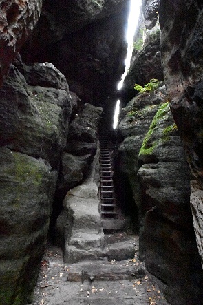 Im oberen Abschnitt ist der Weg so eng, dass keine zwei Personen aneinander vorbei kommen. Auch ist es gegen Ende so steil, dass der Aufstieg auf fest installierten Eisenleitern erfolgen muss. Diese findet man an vielen Stellen im Elbsandsteingebirge. An einer Stelle durchsteigt man dabei ein horizontales, recht enges Felsloch - das Nadelöhr. Hier kommt man mit einem dicken Wanderrucksack schon nicht mehr hindurch!. Mit Wartezeiten an den Engstellen sollte man rechnen, trotzdem ist man hier schneller oben als auf dem Bequemen Weg, auch wenn es wesentlich anstrengender ist. Etwas Grundkondition sollte man hier mitbringen.