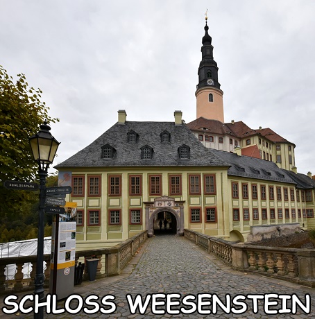 Das Schloss Weesenstein erhebt sich auf einem Felsvorsprung hoch über dem Tal der Müglitz und gehört zur Gemeinde Müglitztal. Der Glimmerschiefer im Tal der Müglitz besitzt Quarzeinlagerungen, die in alter Zeit als "falscher Opal" oder "Wese" bezeichnet wurden. So erklärt sich der Orts- und Schlossname Weesenstein. Nach einem kurzen Weg hoch von der Hauptstraße standen wir an der Kasse und betraten dann über die hochgelegene Brücke das Schloss.