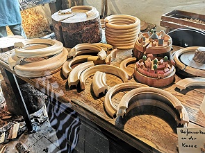 Warum Nassholz? Das ist genau das Geheimnis der Reifenherstellung. Aus dem feuchten Holz werden Scheiben geschnitten, die man in die Drehmaschine einspannen und mit passenden Schneidwerkzeugen bearbeiten kann. Da das Holz noch keine Spannungsrisse durch das Trocknen bekommen hat kann der Reifendreher aus der Holzscheibe mehrere Ringe herausschneiden, die mit unterschiedlichem Durchmesser ineinander liegen. Jeder dieser Holzreifen ist etwa 3 x 3 cm groß und hat etwa 20 bis 30 cm Durchmesser.