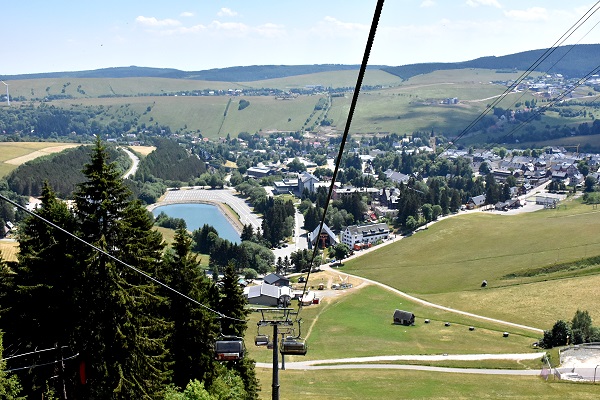 Aber wir sind lieber gemütlich nebenan mit der 4er Sessellbahn auf den Gipfel gefahren. Von dort aus kann man auch mit der neuen Fly-Line wieder zurück ins Tal. Es ist die längste der Welt und es gibt ein Kombiticket Fly-Line plus Bergfahrt für 22,00 Euro. Wir sind beide Wege mit dem Sessellift gefahren, denn ich liebe das seit meiner Kindheit. Während der Fahrt hat man einen herrlichen Ausblick auf das Tal sowie die Skisprungschanzen und kann das Panorama Oberwiesenthals ruhig schwebend genießen.