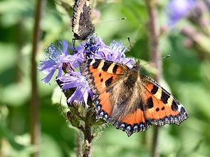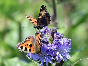 Wenn die meisten Blüten verblüht sind und die Samenstände der Blumen ausgereift sind, ist es Zeit zum Mähen und das fand gerade statt. Bei der klassischen zweischürigen Wiesennutzung wird die Mahd Ende Juni und Ende August durchgeführt. So waren wir rechtzeitig hier oben, um noch die Hälfte der wunderschönen Wiesen mit den Schmetterlingen zu sehen. So bleibt auf Dauer hier oben eine schöne, bunte Blumenwiese erhalten.