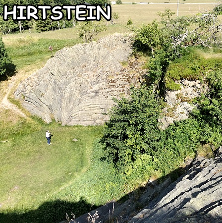Der Basaltfächer am Hirtstein ist eine in Europa geologisch einmalig vorkommende Gesteinsformation. Vor 25 Mio. Jahren während der Zeit des Tertiärs erlosch hier ein Vulkan und bei Steinbrucharbeiten im 19. Jahrhundert wurde diese Steinformation, die an einen Palmwedel erinnert, freigelegt. Die säulenförmige Spaltung des Basaltes entsteht durch Spannungsrisse quer zum Temperaturgradienten bei der Abkühlung.