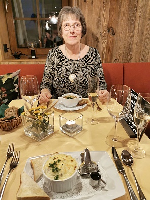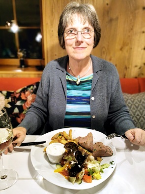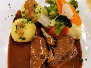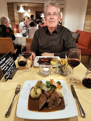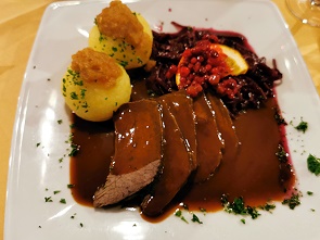 Was dann serviert wurde war sehr lecker und die Portionen üppig. Ob Würzfleisch von der Pute, Sauerbraten vom Hirsch an Apfelrotkohl und Kartoffelklößen oder die ganz hervorragende Kreuztannenroulade vom Kalb gefüllt mit gebratenen Pilzen, Schinken, Zwiebeln und Gewürzgurken mit Gemüse und Kartoffelklöße mit Semmelbutter nappiert - hier hat es geschmeckt.