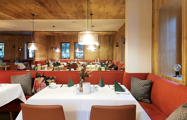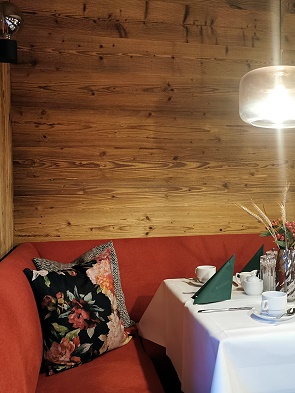 Das Restaurant war auf den Bildern noch im klassischen Stil abgebildet, um so positiver überrascht waren wir beim Betreten. Auch hier hatte man die Corona-Pause genutzt und das komplett Restaurant mit Bar stilvoll und modern renoviert. Richtig gemütlich mit Kissen und warmen Farben wurde hier gearbeitet, in der Mitte steht noch ein alter Kachelofen.