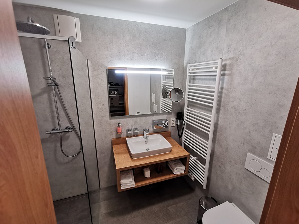 Im schönen Badezimmer findet man Föhn und kostenlose Pflegeprodukte von Rituals. Im Schrank liegen Bademäntel und Schluffen für den Saunabereich. Die Regenwalddusche ist wunderbar, kräfig und heiß. Es gibt genug Ablagefläche und einen beleuchteten Kosmetikspiegel.