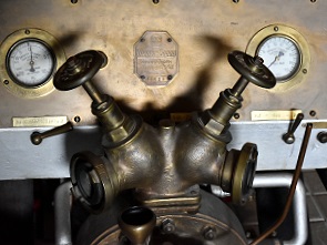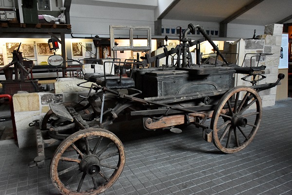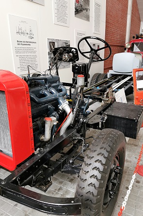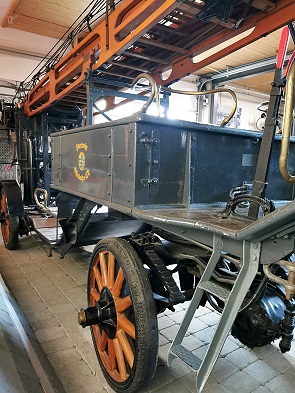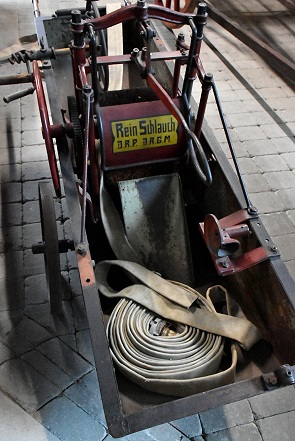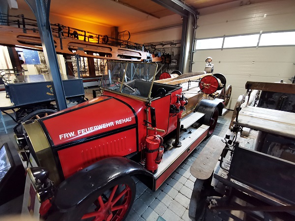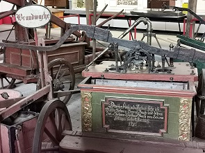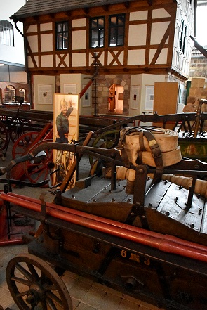 Es beginnt rechts in der Halle 1. Die Zeitreise beginnt mit der der Kontrolle des Feuers durch den Frühmenschen "Homo erectus" vor etwa 400.000 Jahren. Dann folgen die Anfänge des deutschen Brandschutzes im Mittelalter bis hin zum Stand der Feuerwehrtechnik am Ende des 1. Weltkriegs in 1918. Vieles wird auf den Schautafeln beschrieben und in der Mitte stehen einige alte Feuerwehren, Pumpen und Spritzen. Wertvoll und nur hier im Deutschen Feuerwehr-Museum zu sehen: Die weltweit älteste erhaltene fahrbare Handdruckspritze. Sie wurde im Jahr 1624 im ersten Drittel des verheerenden 30jährigen Krieges (1618-48) gebaut.