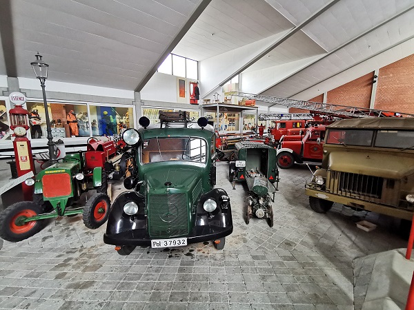 Am Ende des Rundgang kommt man noch an einigen Spielautos für Kinder vorbei. Dann geht es hinüber zur Halle 2, wieder vorbei an der Kasse und an einem Löschteich mit Koi-Karpfen. Hier kann man an einer Handdruckspritze auspobieren, wie Kräfte zehrend der Betrieb eines solchen Gerätes ist. Eine große Hochdruck-Handpumpe mit 200 Liter pro Minute brauchte zur Bedienung im Wechsel drei Gruppen von jeweils 8 oder 10 Personen, die immer nur 4 Minuten lang Höchstleistung erbringen konnten, um sich danach 8 Minuten ausruhen zu können. In einem Nebenraum sind unter anderem Uniformen und einige alte Helme zu sehen.