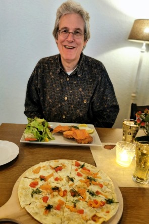 Nach unserem kleinen Spaziergang besuchten wir noch kurz vor Schliessung der Geschäfte die kleine Fußgängerzone, wo wir in einem Laden mit Taschen noch den perfekten Wanderrucksack für den kommenden Urlaub entdeckten und kauften. Dann war Zeit für ein Mittagessen und das es zum Sitzen im Freien ein wenig zu frisch war, lockte uns ein Schild ins gemütliche Cafe Restaurant Fachwerkstube. Hier gab es Flammkuchen mit Lachs für mich und Kartoffelrösti mit Lachs und Salat für Michael. Dazu tranken wir Schorle.