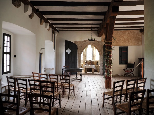 Nach dem Essen war dann die kleine Burgbesichtigung dran. Im hintern Hofteil geht es hinein in den Palas, im Erdgeschoss gibt es neben dem Wirtshaus am Tor noch einen zweiten Gaststättenraum, die Taverne. In der zweiten Etage darüber befindet sich ein restaurierter Rittersaal, wo heute wohl Trauungen stattfinden. Die erste Etage darunter muss noch verschönert werden und ist aktuell leergeräumt. Hinter dem Hof, neben der alten Schmiede, geht es hinaus in den Kräutergarten. Dort endet die Burg mit einer Mauer am Halsgraben.