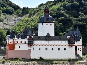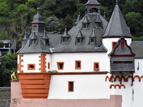 Weltweit bekannt weil millionenfach fotografiert und auch einzigartig im Rheintal ist die mitten im Fluss gelegene Zollburg Pfalzgrafenstein. Sie wurde im Jahr 1327 erbaut und diente dem Bauherren, König Ludwig dem Bayern, Pfalzgraf bei Rhein zur militärischen Sicherung der neu gewonnen Territorien in Kaub gegenüber den Nachbarn, den Kurfürsten von Mainz und Trier. Gleichzeitig sollte die Zollstelle in Kaub, wo der Zoll erhoben wurde, gesichert werden. Im Gegensatz zu den meisten anderen Burgen und Schlössern am Rhein wurde dieses auf einer Insel im Rhein gelegene Bauwerk ausschließlich aus wirtschaftlichen Gründen errichtet und wurde nie zerstört.
