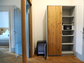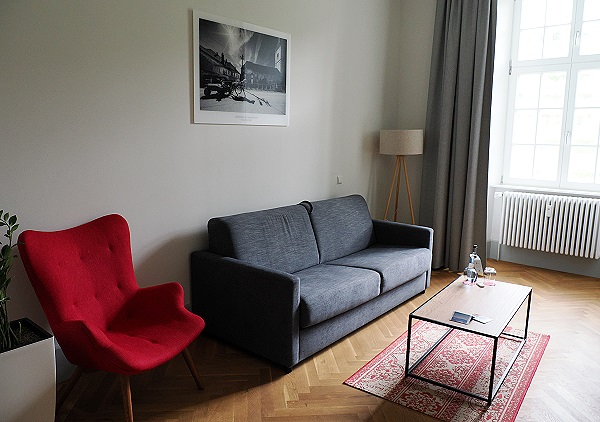 Wir hatten gegen einen kleinen Aufpreis eine Junior Suite mit zwei Zimmern gebucht. Hier hatten wir viel Platz, es gab einen Flur mit Schrank, Safe, Mini-Kühlschrank und Glasabtrennung zum Wohnzimmer. Und daneben einen Schlafraum mit Zugang zum hellen und weiträumigen Bad. Durch die historische Architektur ist hier jedes Zimmer einzigartig, wir hatten die Nummer 103.