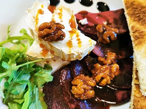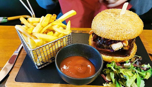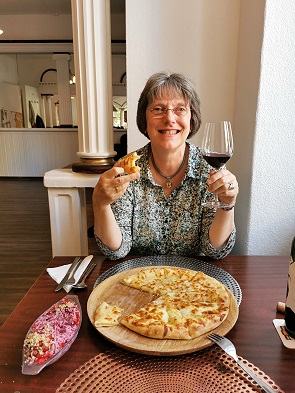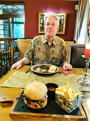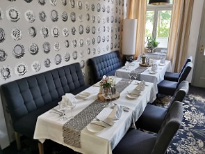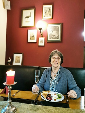 Ich hatte als Vorspeise Rote Beete mit Ziegenkäse und danach einen Wildschweinburger mit Fritten. Beides lecker, Michael hatte einen kleinen Gurkensalat und mit seinen Hirschmedaillons mit Hagebuttensauce und Serviettenknödeln leider etwas Pech. Er meinte, das wäre der älteste Hirsch, den er je gegessen hatte, denn das Fleisch war alles andere als zart. Dazu tranken wir jeweils zwei Sekt und 2 Gläser Merlot. Danach noch einen Marillenbrand und Birnenbrand aus Tschechien von Jelinek, beide sehr aromatisch. Am Ende Betrug die Rechnung dann 85,38 Euro.