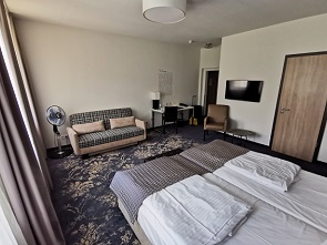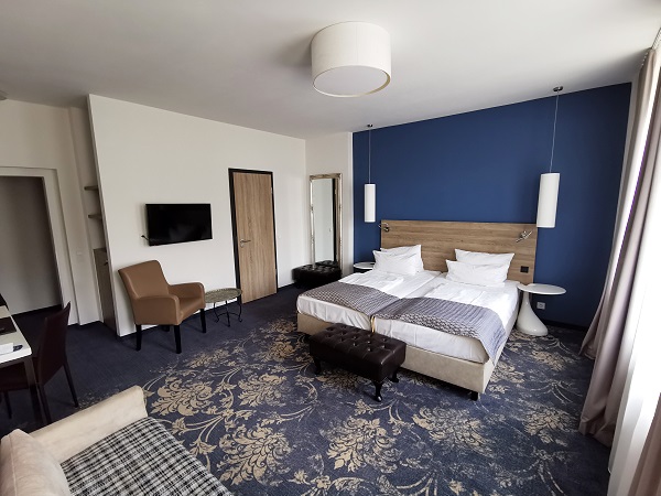 Hier hatten wir 24 m² zur Verfügung und das Fenster lag nach hinten zum Innenhof. So war es sehr ruhig und im bequemen Bett haben wir wunderbar geschlafen. Dazu kommen die üblichen Annehmlichkeiten in dieser Kategorie wie ein Flachbild-TV, schnelles WLAN, Verdunklungsvorhänge und Steckdosen in Bettnähe.