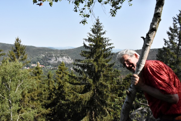 Schon vom Parkplatz aus genossen wir den einzigartigen Ausblick über weitläufige Wiesen und Wälder zu den Böhmischen Bergen im Riesen- und Isergebirge, Jeschken und Bösige. Leider war die Sicht immer etwas trüb und diesig, so dass sich der weite Weg dorthin nicht gelohnt hätte.
