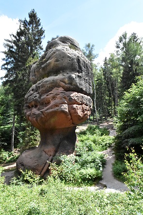 Diese schöne Felsformationen ist ein super Fotomotiv und auch ein Paradies für Kletterer. Seine rote Farbe bekommt der Buntsandstein vom Eisenoxidgehalt, die Form entstand durch Erosion vom Wasser und Windschliff. Kelchstein und Kelchsteinwärter bilden aus der richtigen Perspektive ein Felstor ohne Bogen.