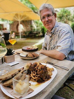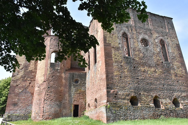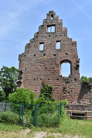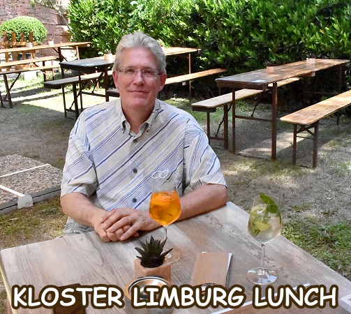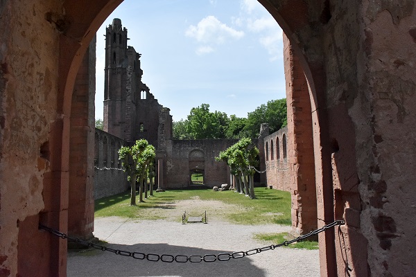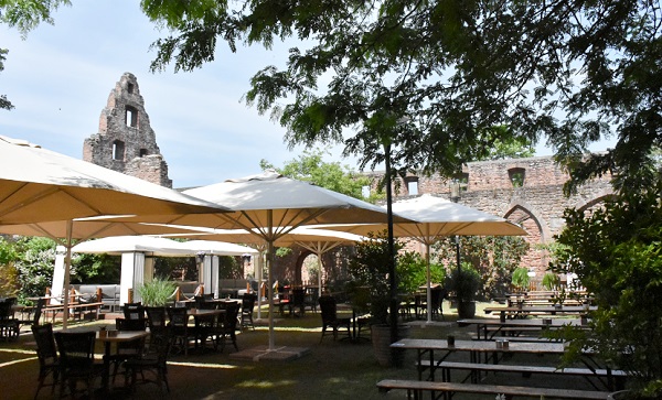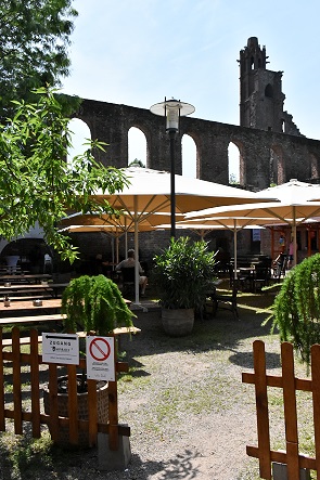 Ein Jahr später wohnten wir 10 Tage in einer schönen Ferienwohnung in Hambach, einem Ortsteil von Neustadt an der Weinstrasse. Von hier aus war es nicht weit zur Klosterruine und wir fuhren nach einem erneuten Besuch der Wachtenburg zum Mittagessen hierher. Denn mittlerweile war auch die Außengastronomie im Klostergarten geöffnet, und da der Tag sonnig und heiß war wollten wir hier die Mittagspause genießen. So konnten wir am Abend in der Ferienwohnung kalte Küche genießen und brauchten nicht mehr zu kochen.