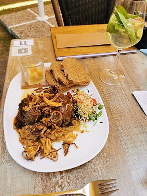 Als wir die Besichtigung beendet hatten, kamen wir zum Eingang der Klosterschänke Konrad2. Zu unserem Glück war sie gerade aufwendig renoviert und nur wenige Wochen zuvor wiedereröffnet, mit neuem Pächter und einem neuem Namen. Die Speisekarte, die auslag, las sich einladend. So genossen wir hier ein leckeres Mittagessen im schön gestalteten Innenraum, das uns lange positiv in Erinnerung blieb.