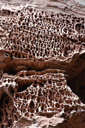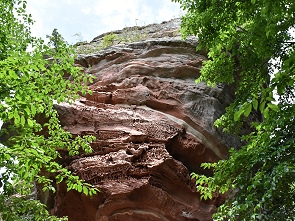 Von hier aus läuft man dann nur noch einen knappen Kilometer hoch zur Burgruine. Der Weg durch den Wald ist gut zu gehen und führt rund um den Berg hinauf, schon bald steht man vor einem mächtigen Felsen, der von unten wunderschöne Verwitterungsmuster zeigt. Sehr beeindruckend ist es direkt darunter zu stehen, genau unterhalb der Burg. Ein schmaler Pfad führt dann an dem Fels entlang, um eine Ecke und hinein in die Burgruine.