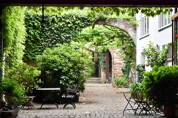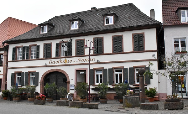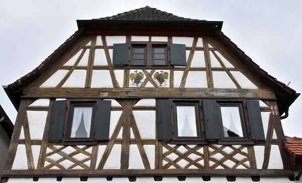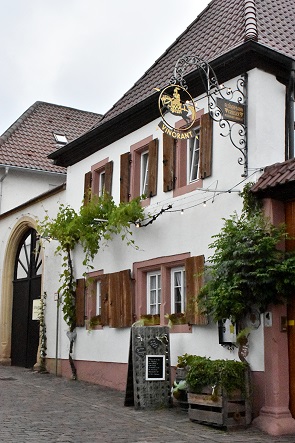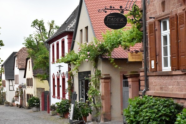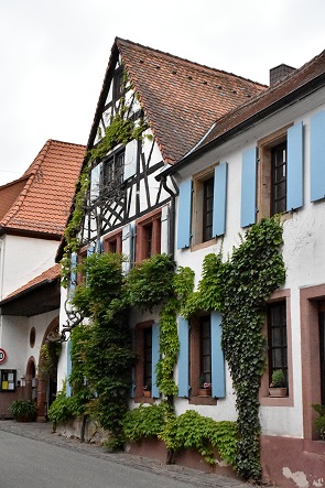 Diese sogenannte Haus-Hof-Bauweise ist generell typisch für Höfe der Vorderpfalz und hinter den Toren verbirgt sich manchmal nur ein Autostellplatz, manchmal ein lauschiger Innenhof mit Weinreben und Außengastronomie. Man sieht sie auch in anderen Orten der Umhgebung, aber hier gibt es besonders viele davon an beinahe jedem Haus.