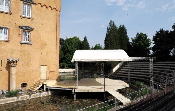 Wir schauten von unseren Fenstern aus auch hinunter auf die Veranstaltungsbühne, die nicht ganz so malerisch war. Hier finden im Sommer die Schlossfestspiele statt. Auch mit anderen Events wie Krimidinner, Gruseldinner oder Kunsthandwerkermarkt lockt man Gäste hingter die Schlossmauern. Aufgrund von Corona waren diese Veranstaltungen eine Weile ausgefallen, daher brauchte der Bühnenbereich jetzt etwas Pflege.