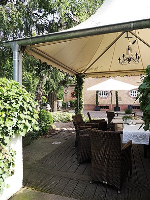 Am nächsten Morgen nahmen wir auch das Frühstück auf der Terrasse vor dem Eingang ein, ein Buffet war im Restaurant in einem Winkel aufgebaut - leider mit Stufen. Schönes, umfangreiches Frühstück und guter Service. Davon haben wir leider gar kein Foto gemacht, nach dem Frühstück haben wir gepackt und nach einem Stopp beim Winzer mit Weinkauf ging es dann zurück nach Köln.