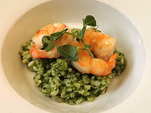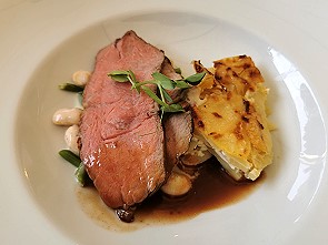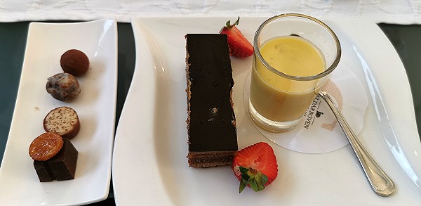 Das angebotene Menü war keine Quelle der Inspiration, aber alles frisch und sehr lecker, mit guten Zutaten und auch handwerklich gut gemacht. Grundsolide Melone mit Schinken, Risotto mit Shrimps und rosa gebratene Roastbeefscheiben mit Bohnen und Kartoffelgratin. Die Nachspeise war üppig mit diversen Pralinen, Schokokuchen, Erdbeeren und Vanillecreme. Alles in allem waren wir nicht nur satt, sondern auch zufrieden, und der Service hier war nett und flink.