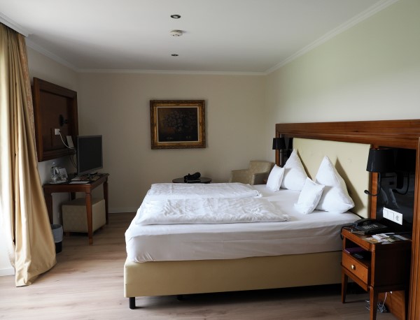 Unser großzügiges Doppelzimmer Nummer 306 war ausgestattet mit Bad, LCD-TV, dimmbaren Lichtern, Radio, Minibar, Safe und kostenlosem WLAN sowie Ausblicken auf die Weinreben innerhalb der Schlossmauern. Die helle Einrichtung war auf ca. 20 m² eine Mischung aus Moderne und romantischem Biedermeierstil des 19. Jahrhunderts, mit Marmorbad und hochwertigen Pflegeprodukten. Im bequemen, extralangen Bett haben wir sehr gut geschlafen.