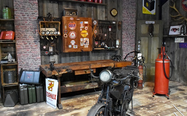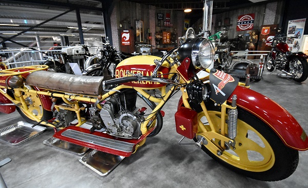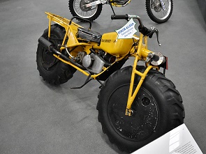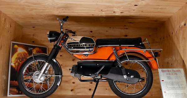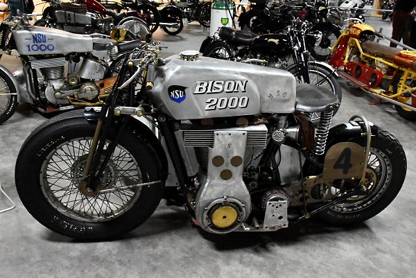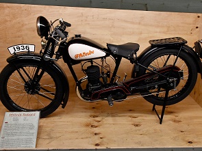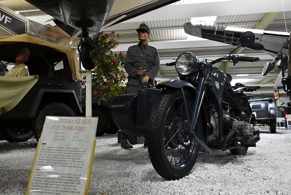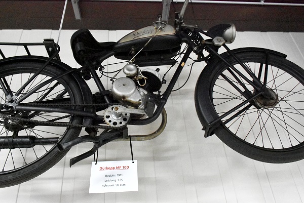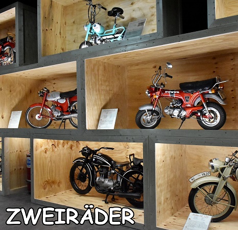 In einer eignen Abteilung in der Halle 2 stehen die Motorräder anspruchsvoll präsentiert in Holzrahmen, die übereinander gestapelt sind. Hier kann man auch das Mauser Einspurauto bewundern, von der Waffenfirma Mauser die nach dem 1. Weltkrieg keine Rüstungsgüter mehr produzieren durfte. Daher versuchte man sich u.a. im Fahrzeugbau. Es handelt sich um ein Motorrad mit zwei seitlichen Stützrädern. Beim Anfahren stand das Fahrzeug auf vier Rädern, aber sobald eine ausreichende Geschwindigkeit erreicht war, konnten die Stützräder mit einem Hebel nach oben gezogen werden. Ab ab 1923 wurde in Serie produziert.